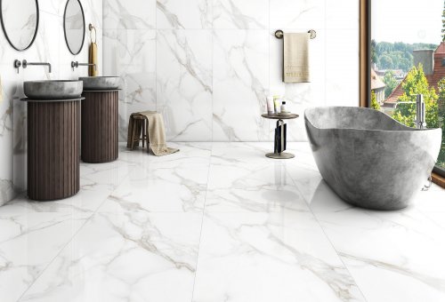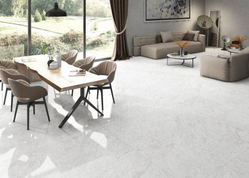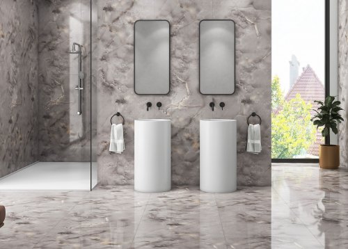 Доступные в голубом, белом и сером цветах, плитки 80x160 см удачно имитируют благородные камни, такие как мрамор, оникс и гранит. Этот продукт сочетает в себе элегантность и практичность, что делает его идеальным выбором для напольного покрытия в любом доме.